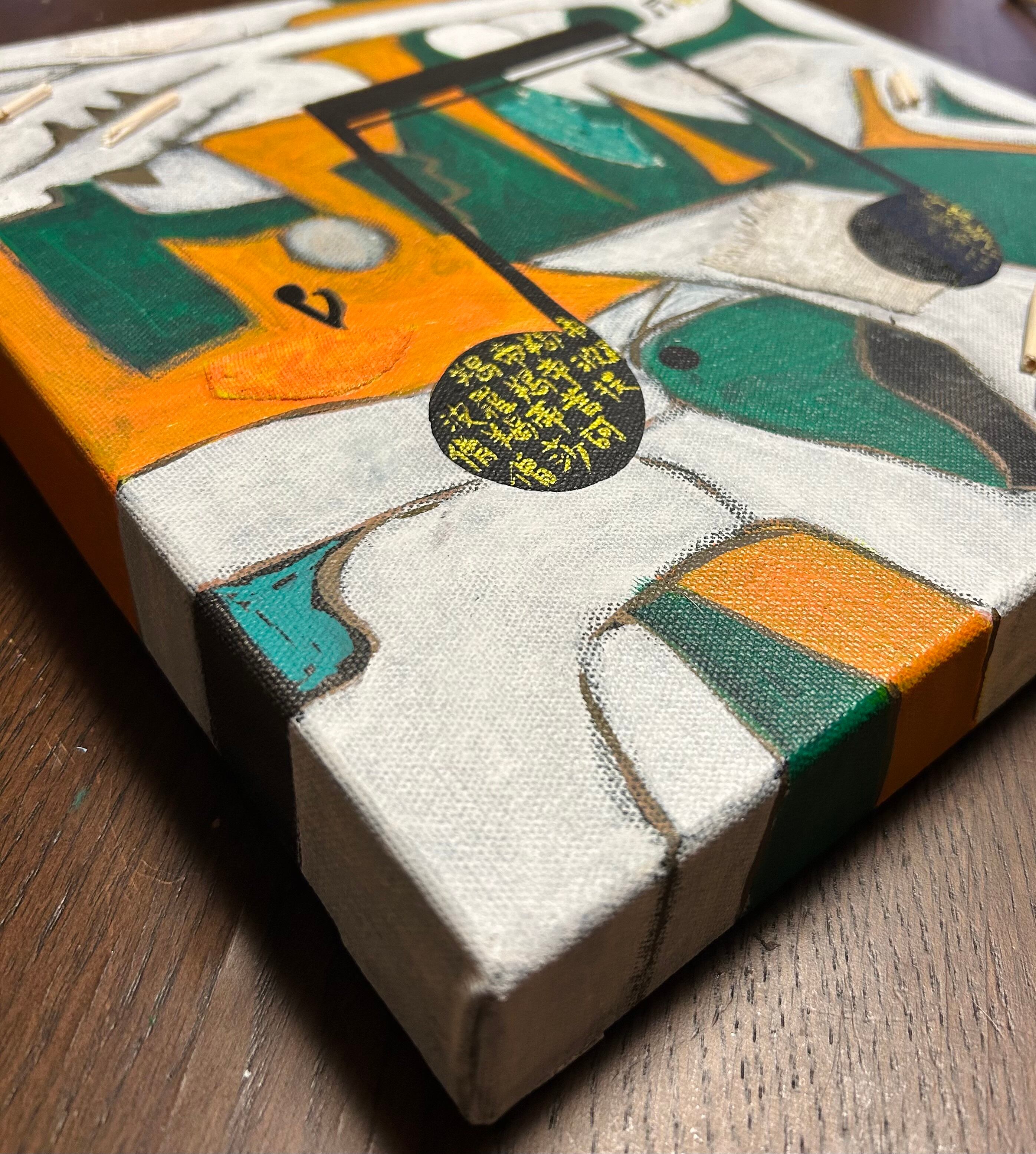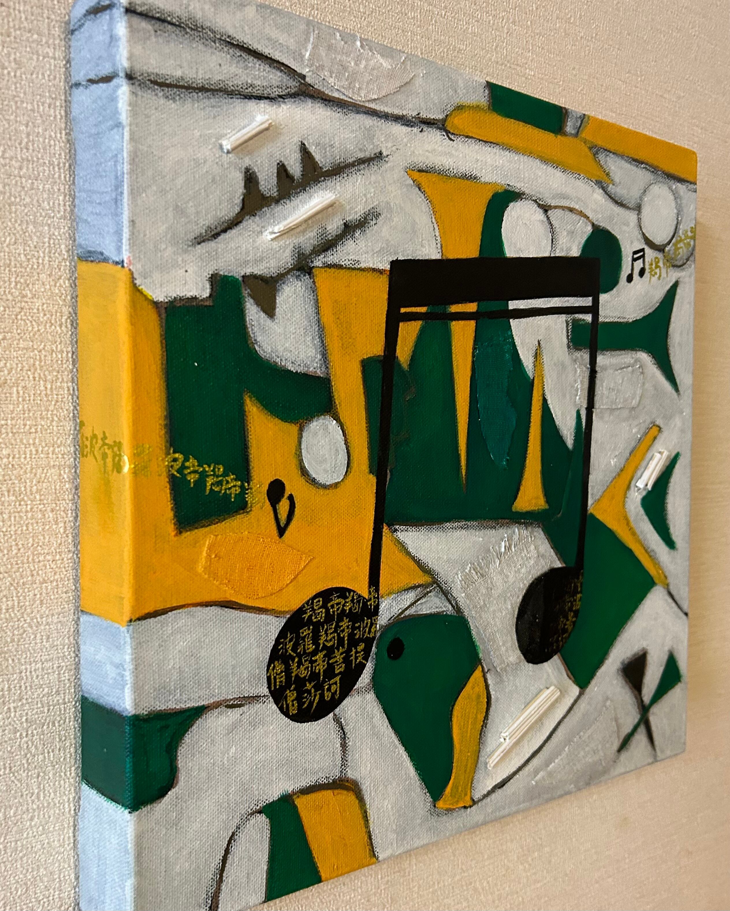 インドの国旗をイメージしたカラフルな色合いの絵画。音符に般若心経の一部を書いています。